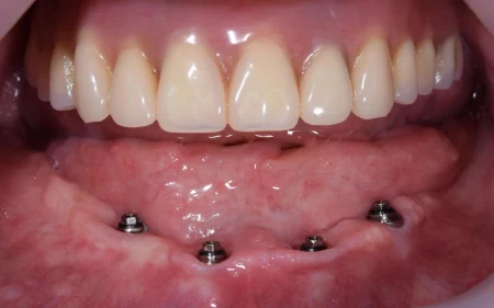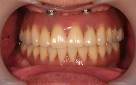 60代男性「歯がどんどん抜けて噛めない」連結した複数の人工歯をインプラントで支える「All on 4」で噛み合わせを改善させ、しっかり噛めるようにした症例
