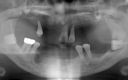 拝見したところ、歯を支える顎の骨が溶ける重度の「歯周病」が原因で、残っているすべての歯がグラグラと揺れており、保存が難しい状態でした。