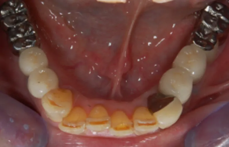 拝見したところ、下の両側の奥歯(第1小臼歯/4番〜第2大臼歯/7番)が欠損しており、前歯でしか物が噛めない状態でした。 取り外し式の入れ歯をご使用されていましたが、違和感があるご様子で、装着すると吐き気が出てしまっていました。