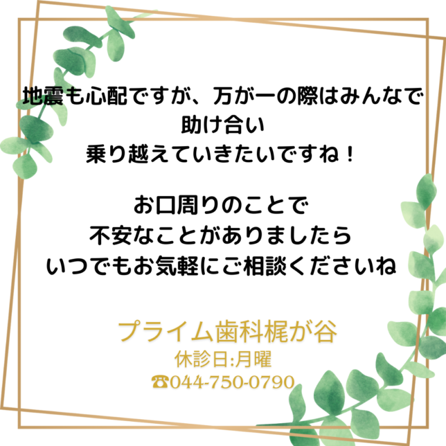 #土日祝診療#高津区#梶が谷#歯医者#歯医者さん#虫歯予防#歯周病#矯正歯科#インプラント#地震#災害対策#口腔ケア