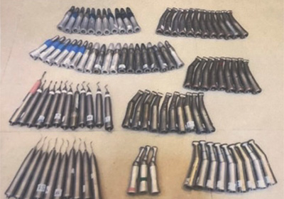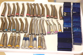 当医院では、歯科用切削器具はすべて滅菌済みの物を患者様に使用しております。開業当初より、非常に高価ではありますがタービンヘッド、倍速コントラを順次増やしており、たくさんの器具を保有することで、前半の治療が終わった際にすべての切削器具を滅菌し使用しています。バースタンドにおいても、同じセット数を組ませていただき使用しています。しかし、多くの歯科医院では、この切削器具が患者様使用の度に滅菌することが難しいとされています。その理由として、