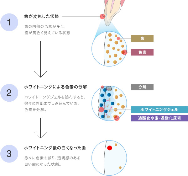 ホワイトニング剤に含まれる過酸化水素や過酸化尿素には、歯を傷めることなく内部の色素を細かく分解する力があります。ホワイトニング剤を塗布すると、ペリクル(歯の表面を覆っている保護膜)が剥がれ、エナメル質の微細な穴から薬液が浸透し、歯の色素を分解することによって白くします。